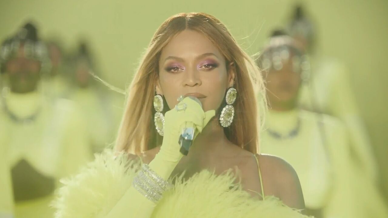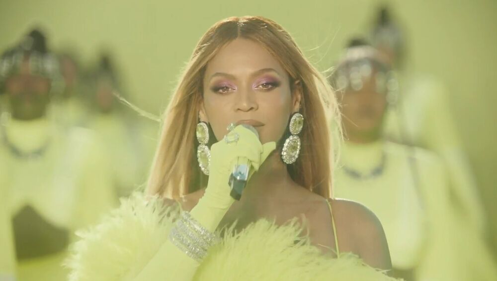 Con un set situado en el exterior del teatro Dolby de Los Ángeles, Beyoncé ha aparecido rodeada por sus bailarinas y los músicos con un total look en verde limón, a juego con las paredes y el suelo de la localización.