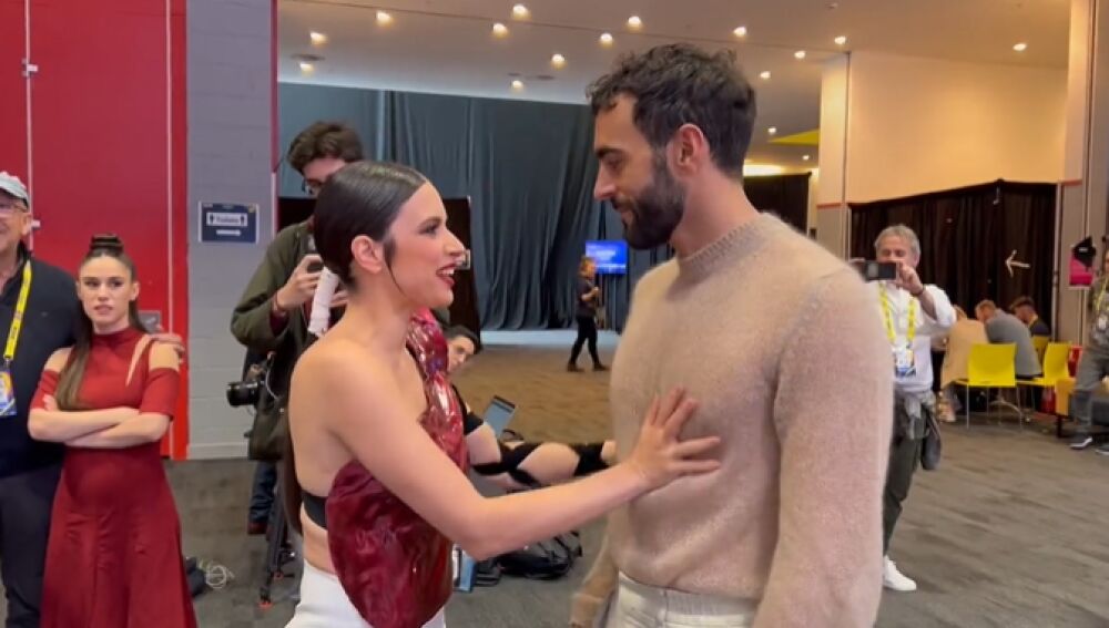 El entusiasmo de la representante española al conocer al italiano fue evidente en sus palabras y también en sus gestos. La cantante de EAEA estrechó el contacto con el cantante de Due Vite y comprobó de primera mano que los músculos que se intuyen bajo su ropa son reales.
