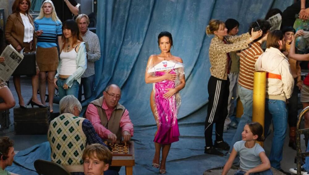 Dos señores mayores jugando al ajedrez, una niña con un perro, un niño con un balón de fútbol y mirando a cámara, un rodaje al fondo... Mientras que la artista brilla más que el resto en el centro de la imagen.